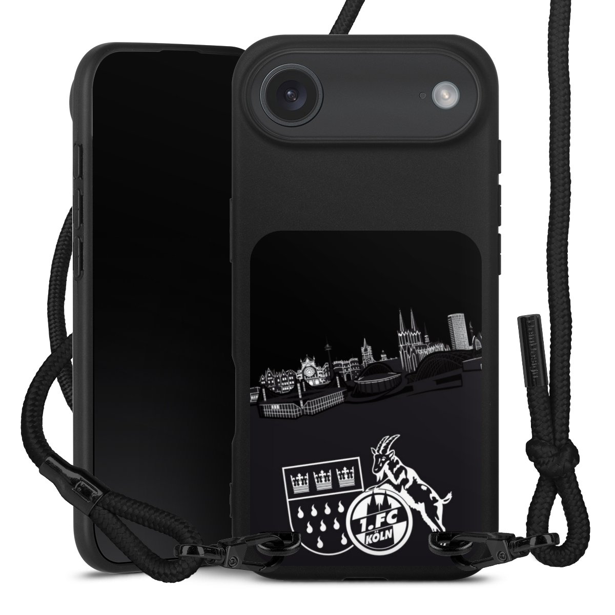 Pure Black: Handyhülle, Stoffband und Metalldetails in stylischem Mattschwarz.