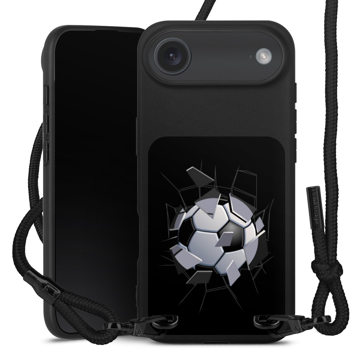 Pure Black: Handyhülle, Stoffband und Metalldetails in stylischem Mattschwarz.
