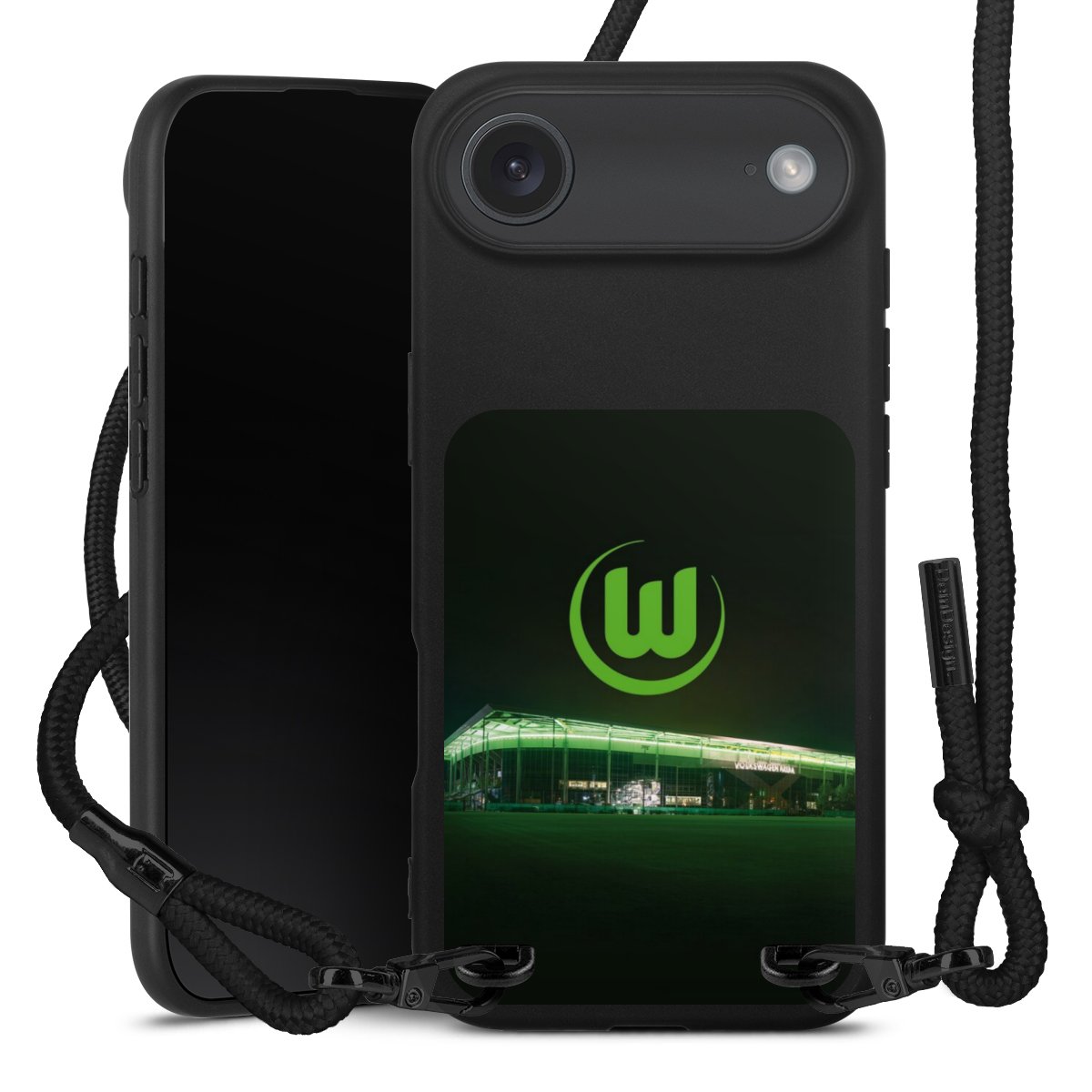 Pure Black: Handyhülle, Stoffband und Metalldetails in stylischem Mattschwarz.