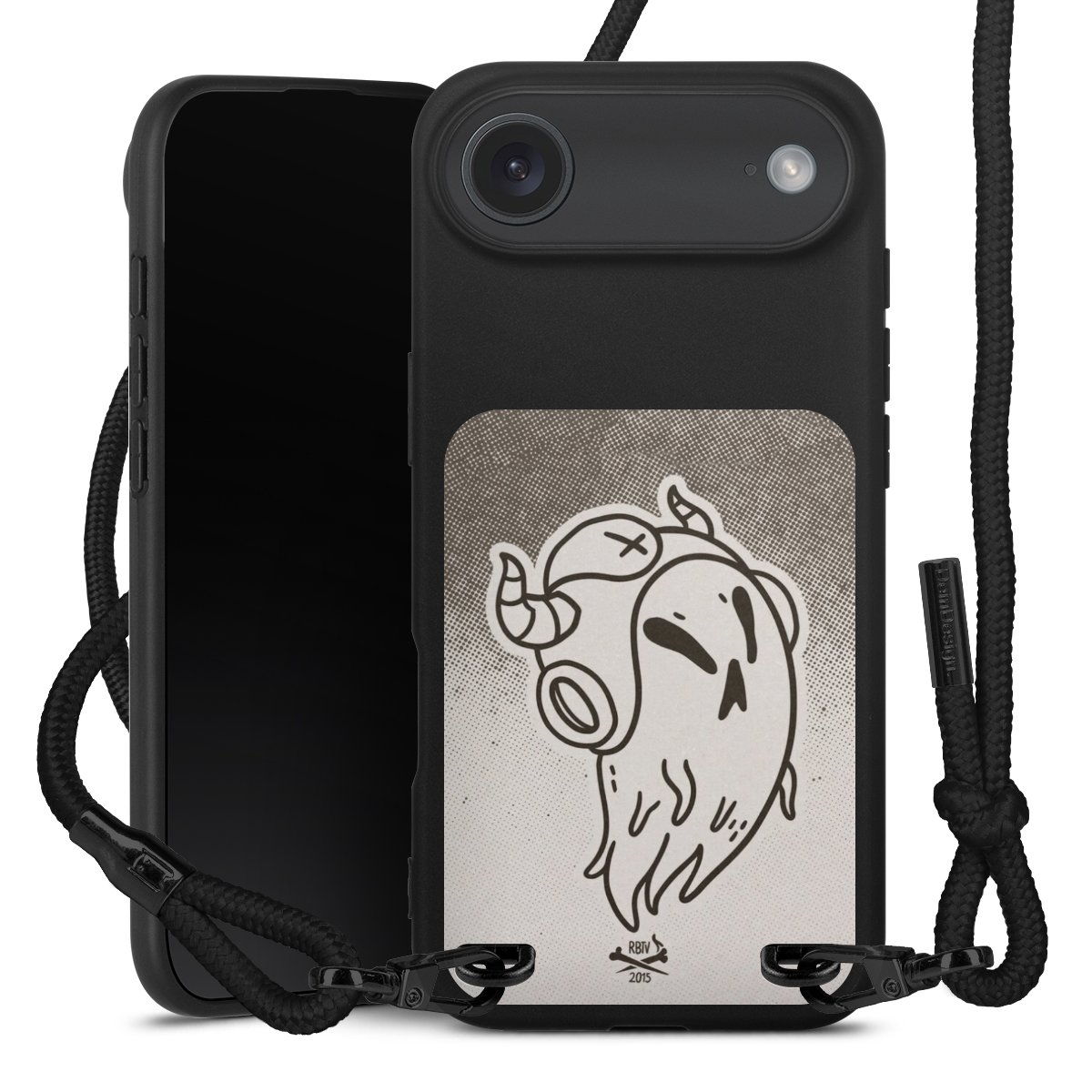Pure Black: Handyhülle, Stoffband und Metalldetails in stylischem Mattschwarz.