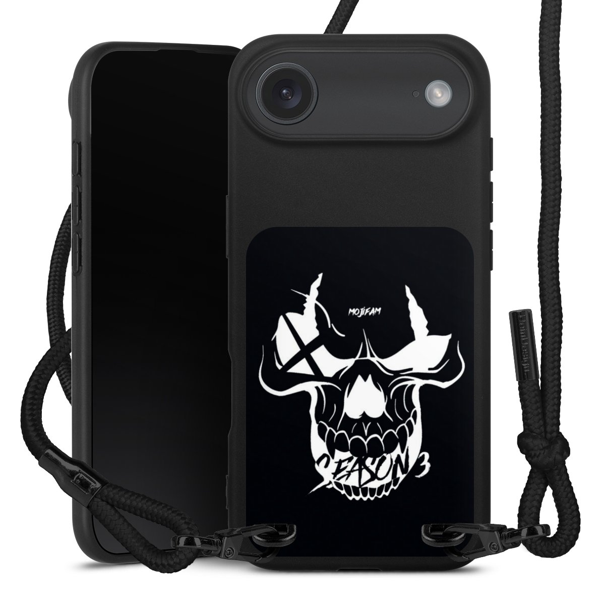 Pure Black: Handyhülle, Stoffband und Metalldetails in stylischem Mattschwarz.
