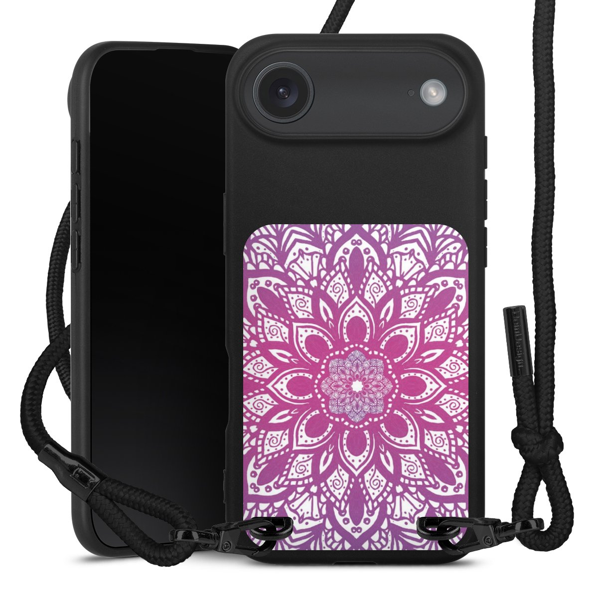 Pure Black: Handyhülle, Stoffband und Metalldetails in stylischem Mattschwarz.