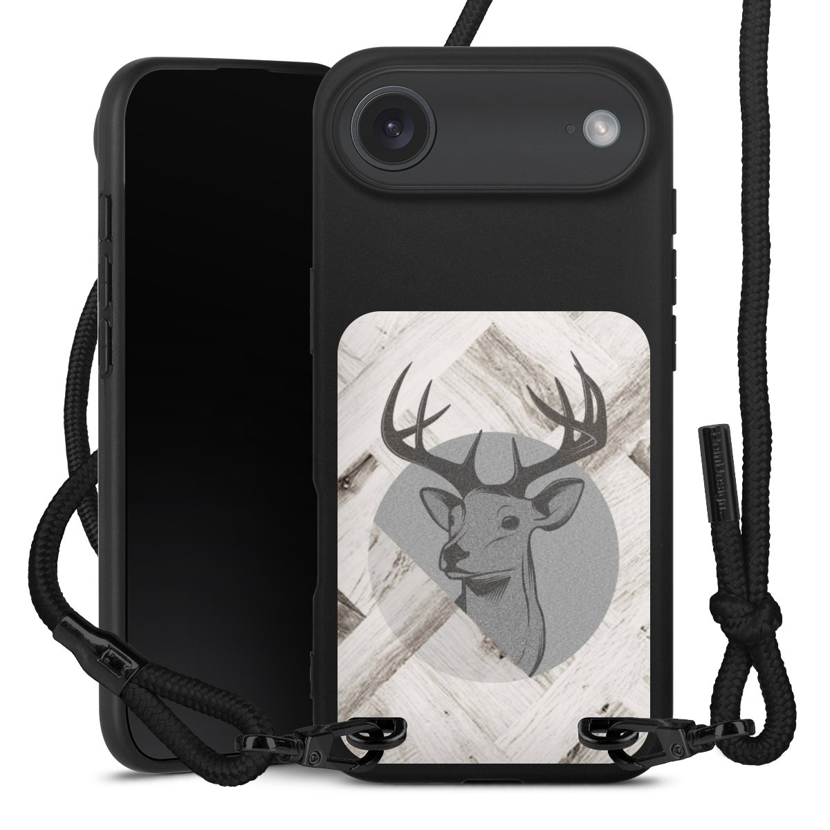 Pure Black: Handyhülle, Stoffband und Metalldetails in stylischem Mattschwarz.