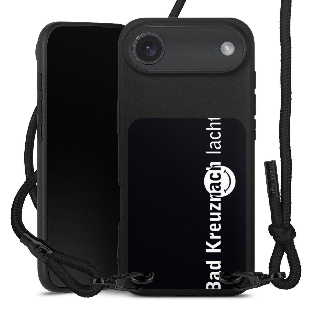 Pure Black: Handyhülle, Stoffband und Metalldetails in stylischem Mattschwarz.