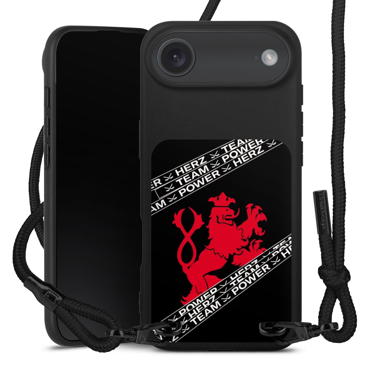Pure Black: Handyhülle, Stoffband und Metalldetails in stylischem Mattschwarz.