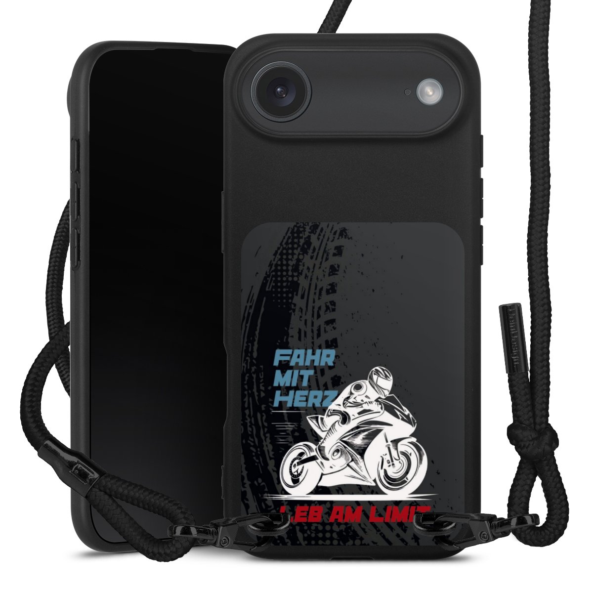 Pure Black: Handyhülle, Stoffband und Metalldetails in stylischem Mattschwarz.