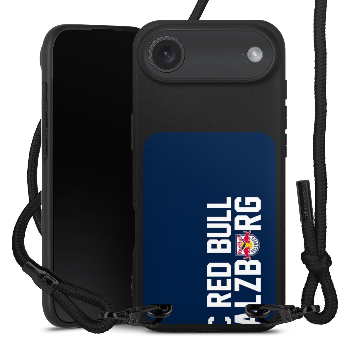 Pure Black: Handyhülle, Stoffband und Metalldetails in stylischem Mattschwarz.