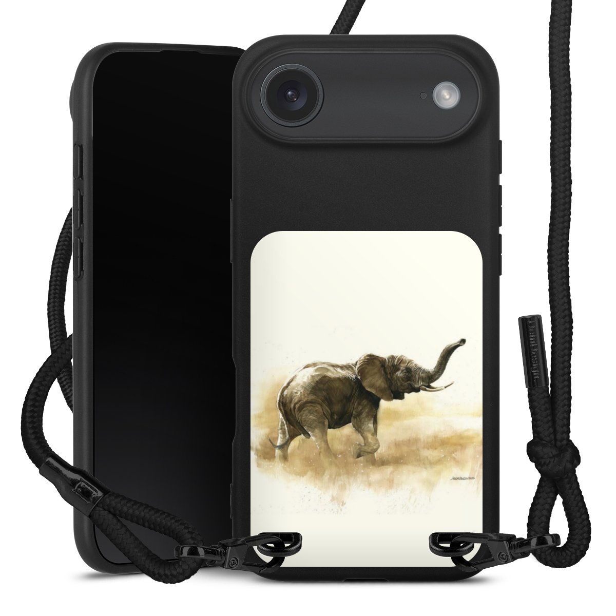 Pure Black: Handyhülle, Stoffband und Metalldetails in stylischem Mattschwarz.