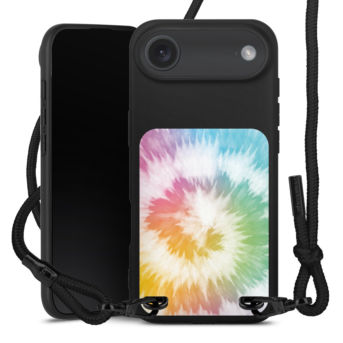 Pure Black: Handyhülle, Stoffband und Metalldetails in stylischem Mattschwarz.