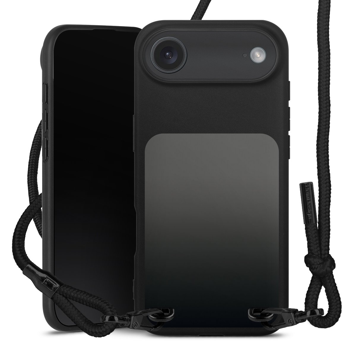 Pure Black: Handyhülle, Stoffband und Metalldetails in stylischem Mattschwarz.