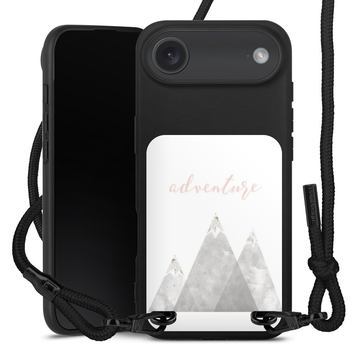 Pure Black: Handyhülle, Stoffband und Metalldetails in stylischem Mattschwarz.