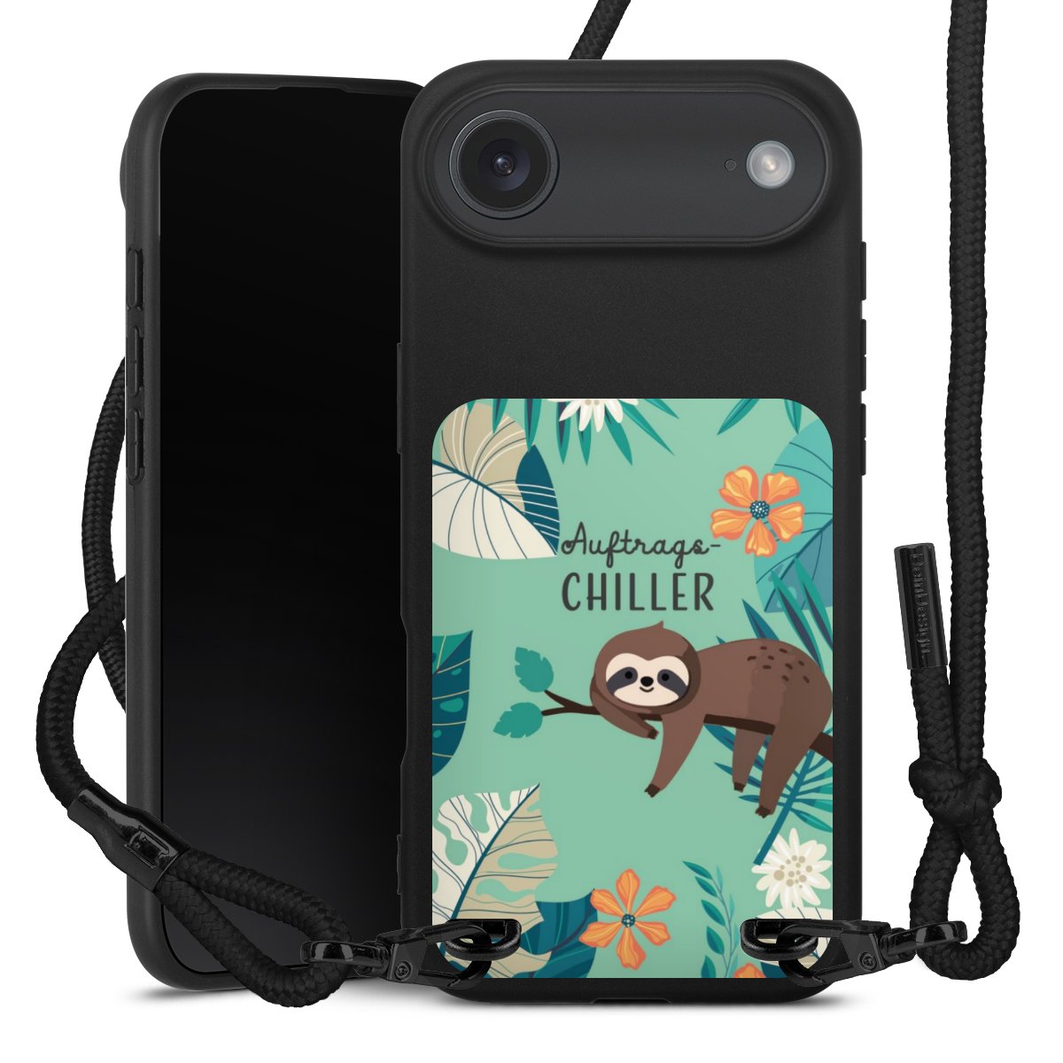 Pure Black: Handyhülle, Stoffband und Metalldetails in stylischem Mattschwarz.