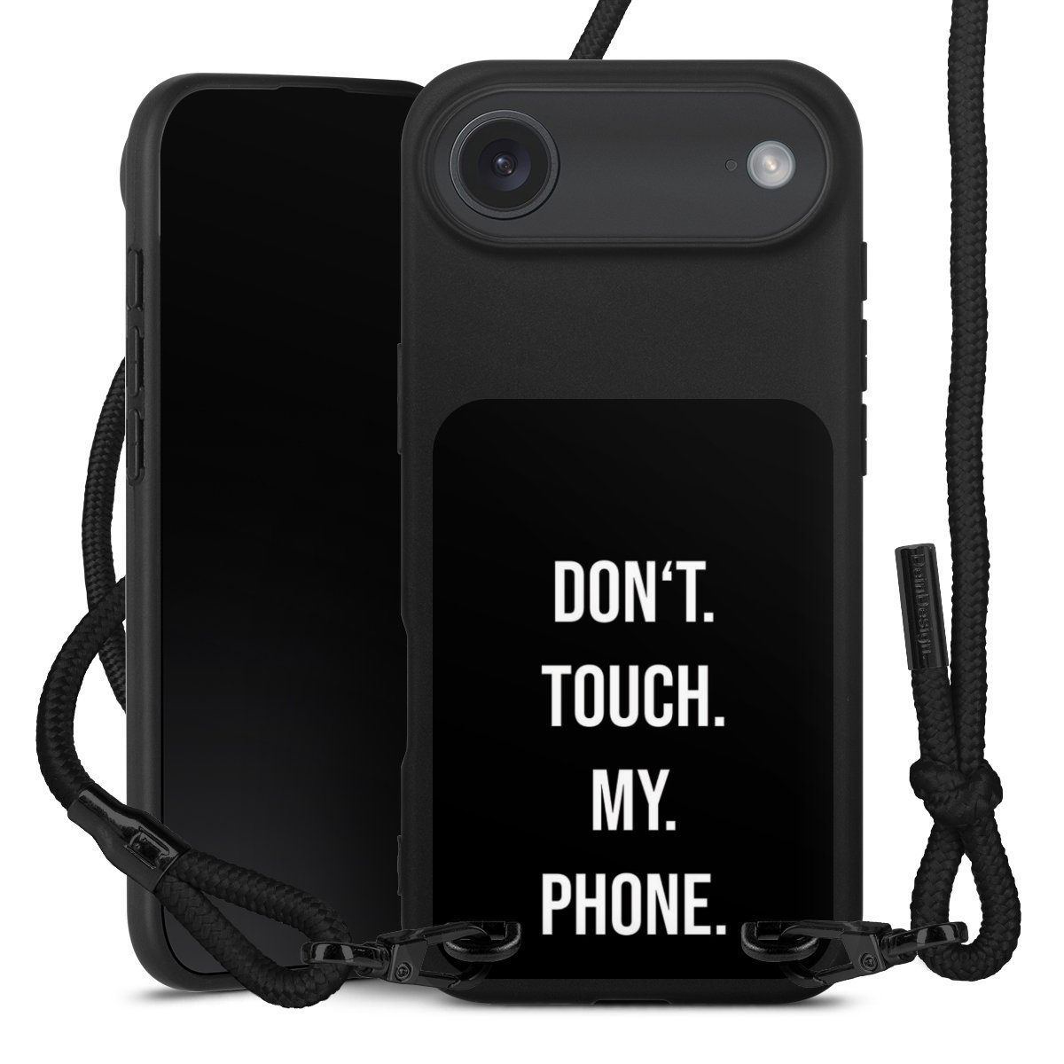 Pure Black: Handyhülle, Stoffband und Metalldetails in stylischem Mattschwarz.