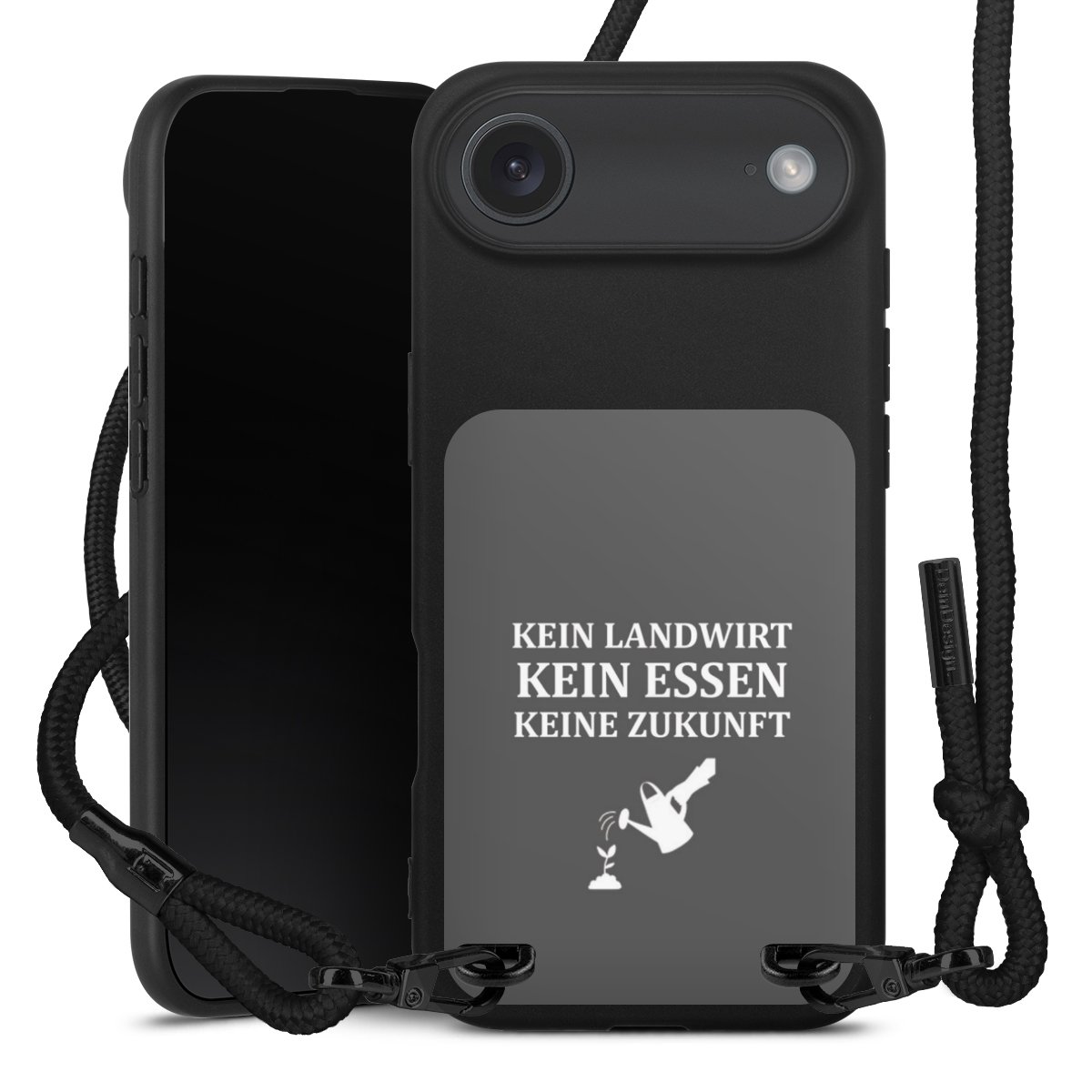 Pure Black: Handyhülle, Stoffband und Metalldetails in stylischem Mattschwarz.