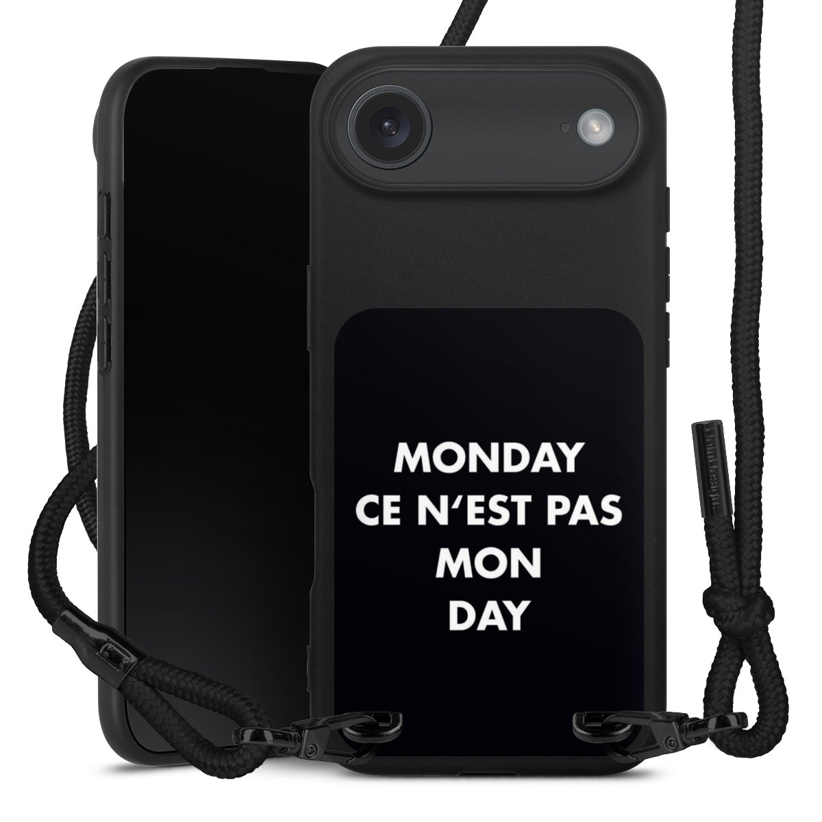 Pure Black: Handyhülle, Stoffband und Metalldetails in stylischem Mattschwarz.