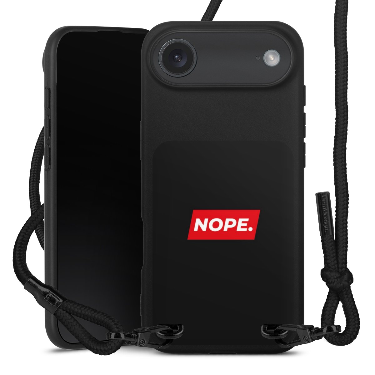 Pure Black: Handyhülle, Stoffband und Metalldetails in stylischem Mattschwarz.