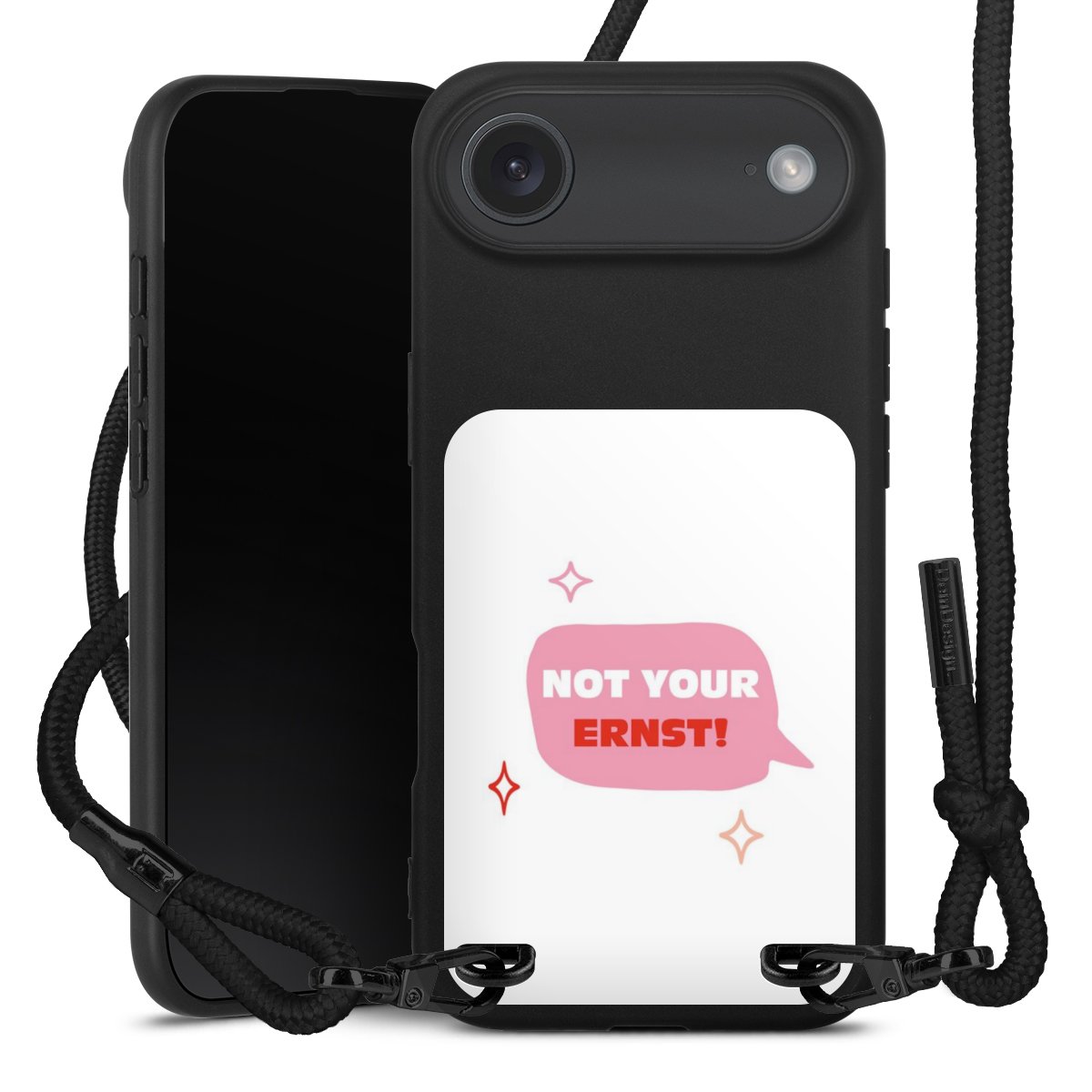 Pure Black: Handyhülle, Stoffband und Metalldetails in stylischem Mattschwarz.