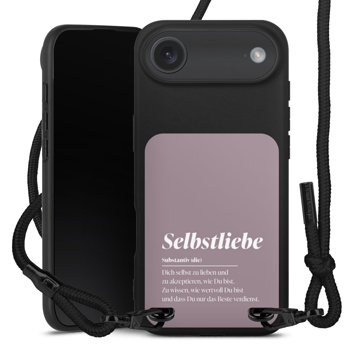 Pure Black: Handyhülle, Stoffband und Metalldetails in stylischem Mattschwarz.