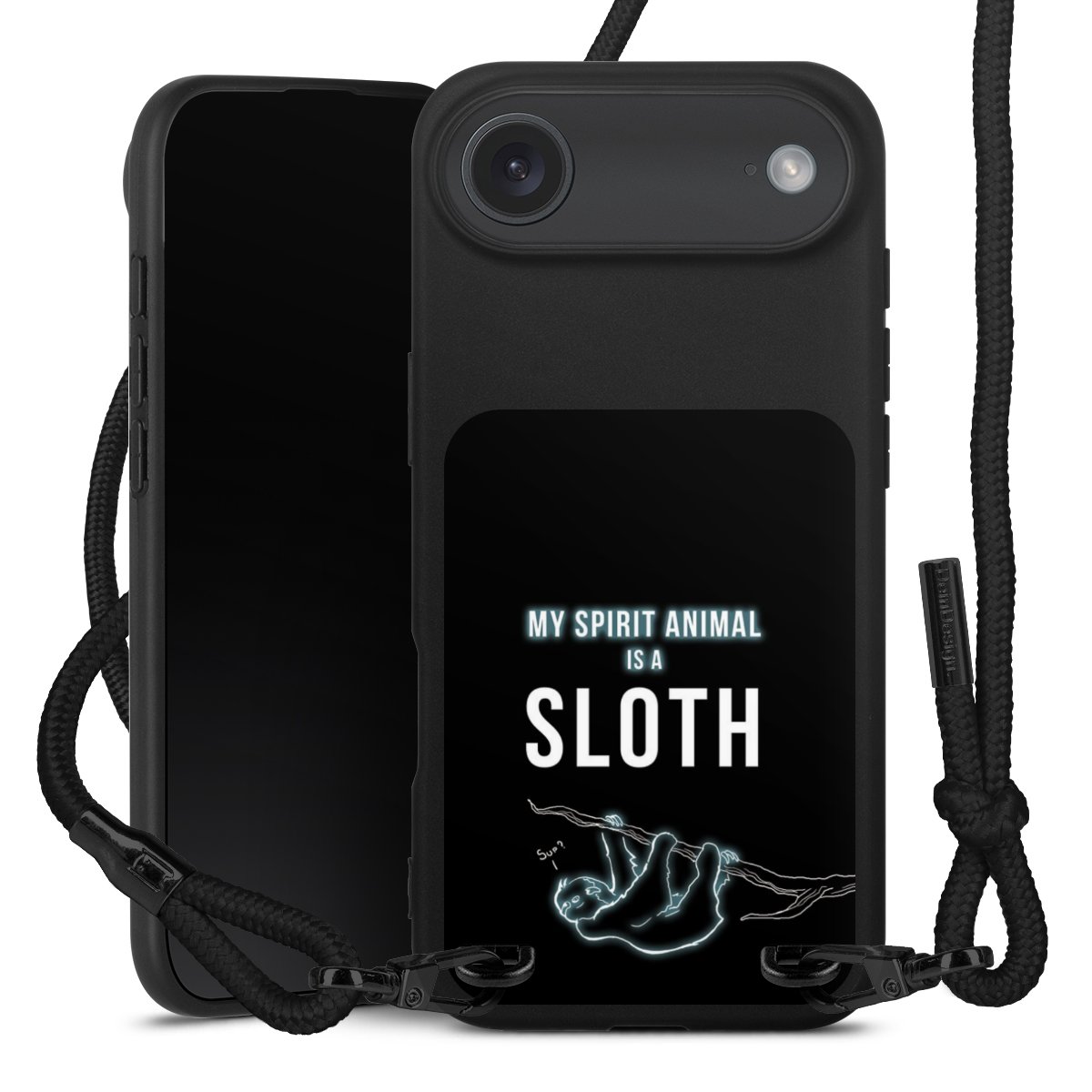 Pure Black: Handyhülle, Stoffband und Metalldetails in stylischem Mattschwarz.