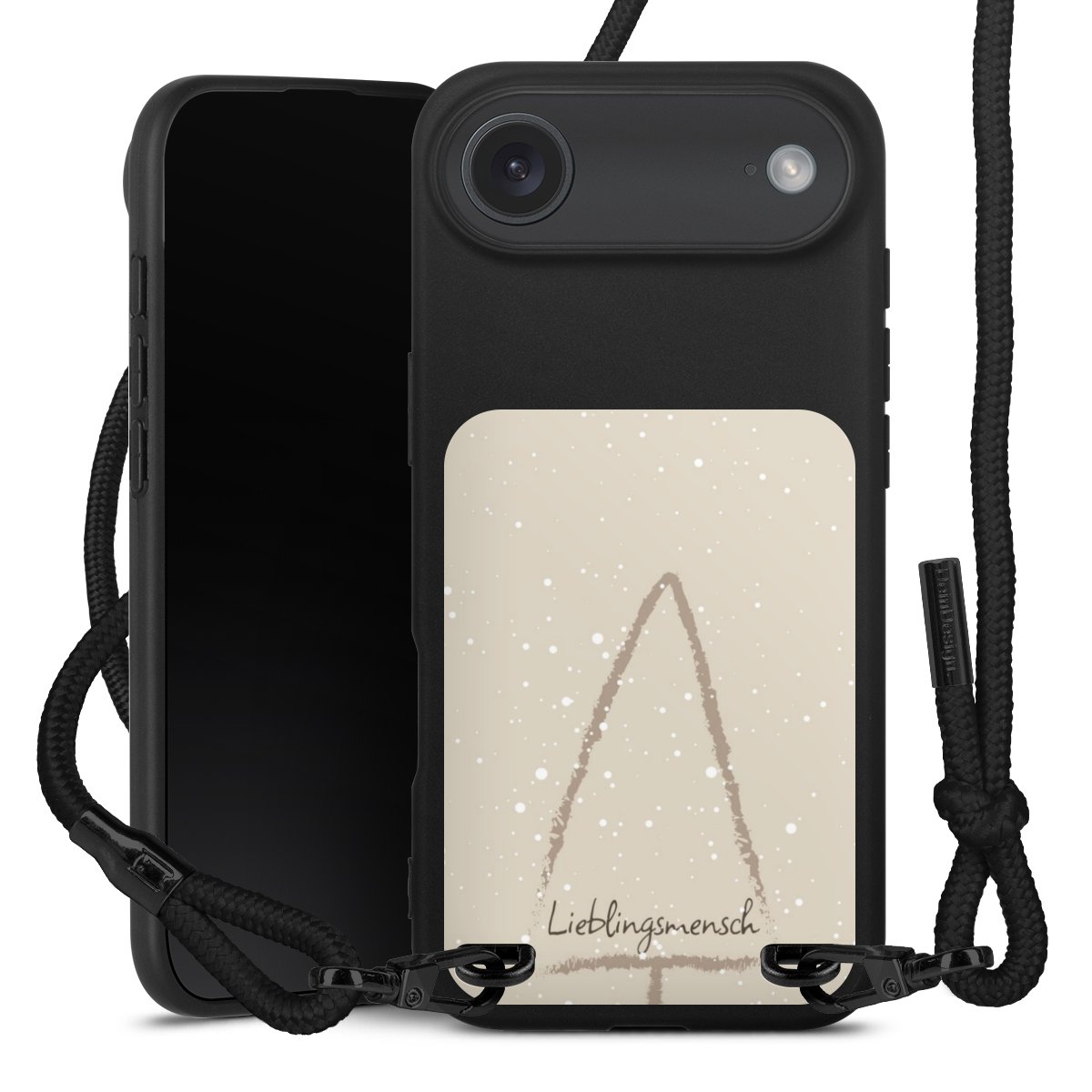 Pure Black: Handyhülle, Stoffband und Metalldetails in stylischem Mattschwarz.