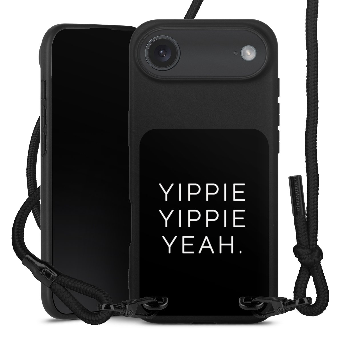 Pure Black: Handyhülle, Stoffband und Metalldetails in stylischem Mattschwarz.