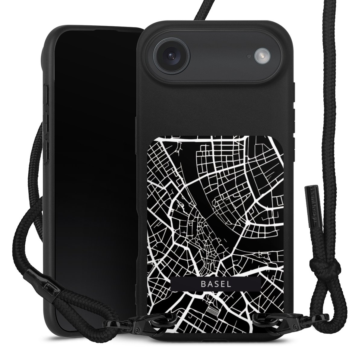 Pure Black: Handyhülle, Stoffband und Metalldetails in stylischem Mattschwarz.