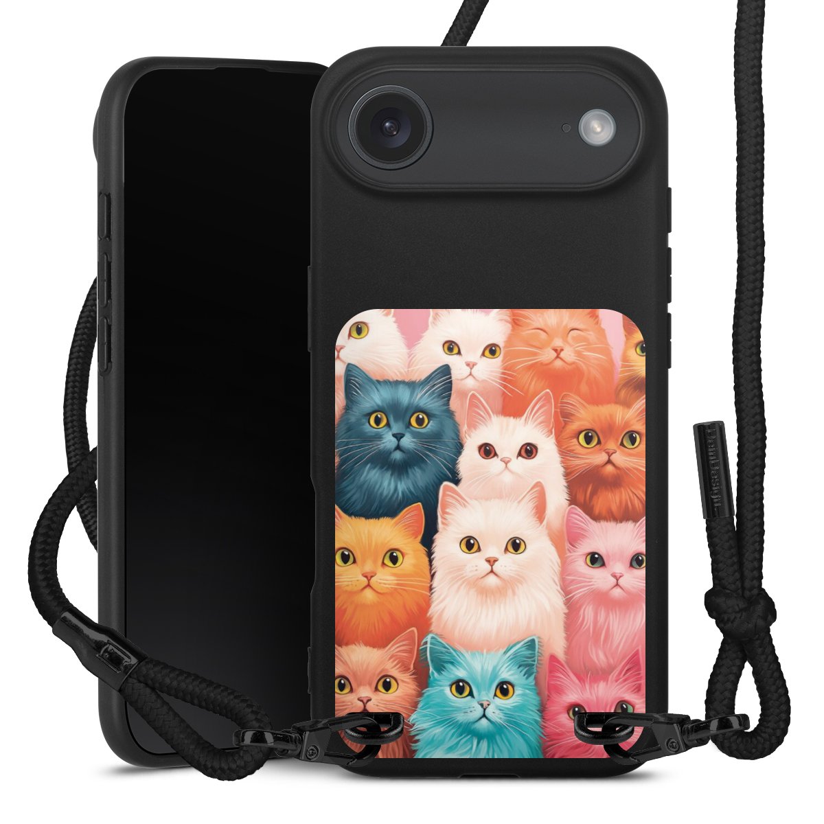 Pure Black: Handyhülle, Stoffband und Metalldetails in stylischem Mattschwarz.
