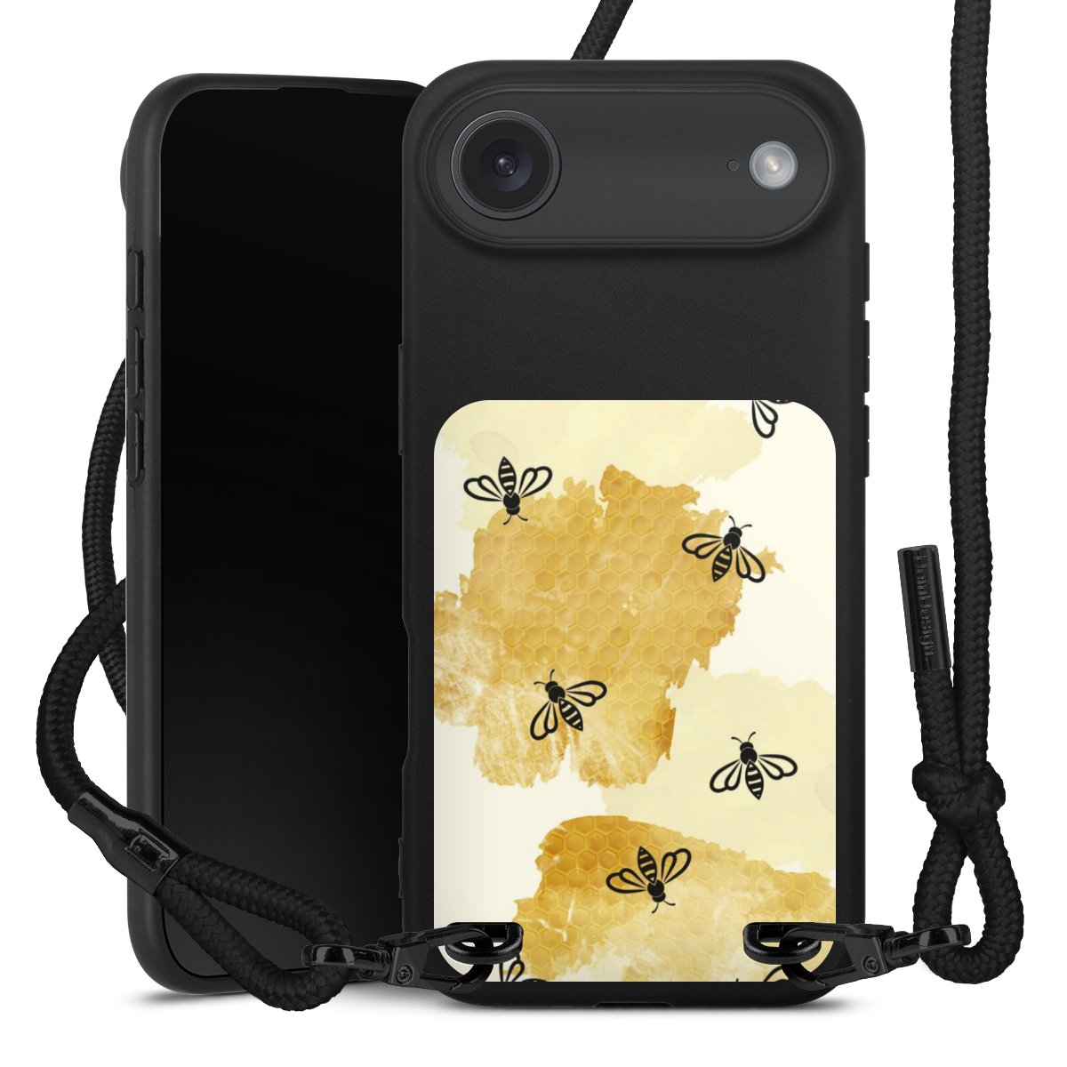 Pure Black: Handyhülle, Stoffband und Metalldetails in stylischem Mattschwarz.