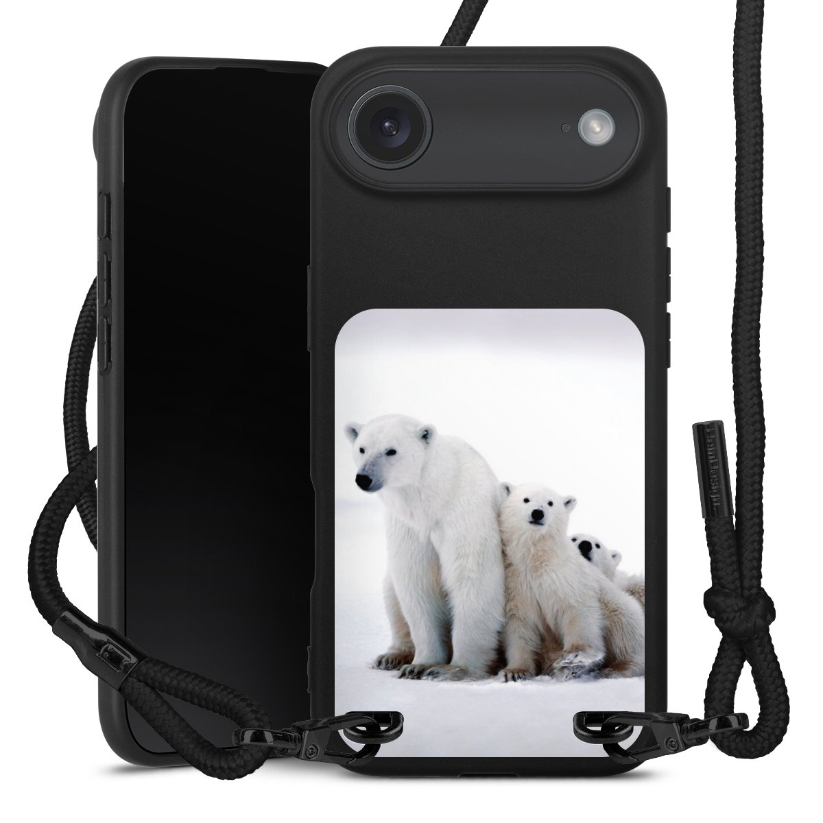 Pure Black: Handyhülle, Stoffband und Metalldetails in stylischem Mattschwarz.