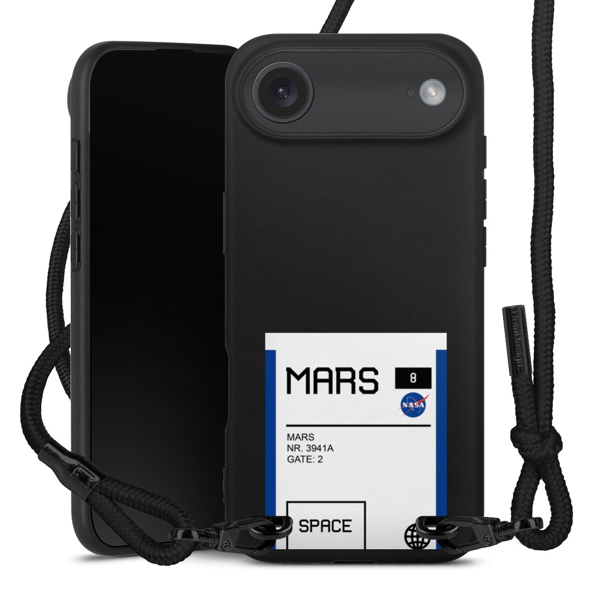 Pure Black: Handyhülle, Stoffband und Metalldetails in stylischem Mattschwarz.