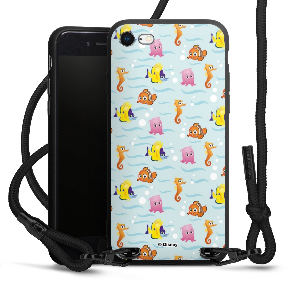 Pure Black: Handyhülle, Stoffband und Metalldetails in stylischem Mattschwarz.