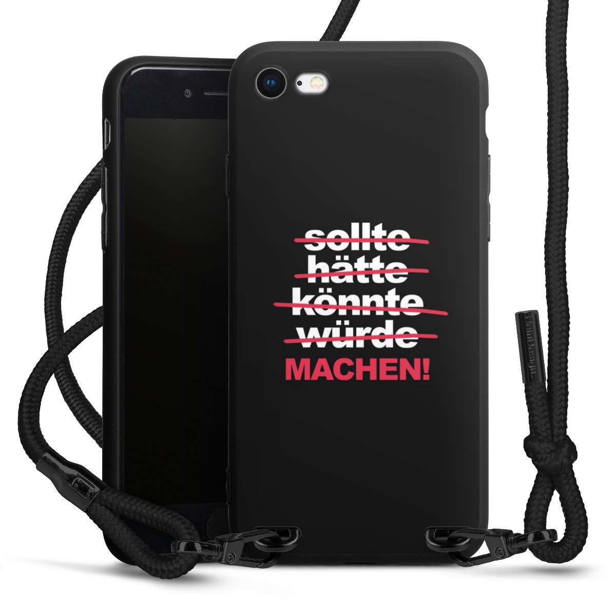 Pure Black: Handyhülle, Stoffband und Metalldetails in stylischem Mattschwarz.