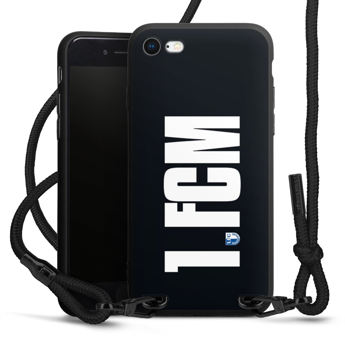 Pure Black: Handyhülle, Stoffband und Metalldetails in stylischem Mattschwarz.