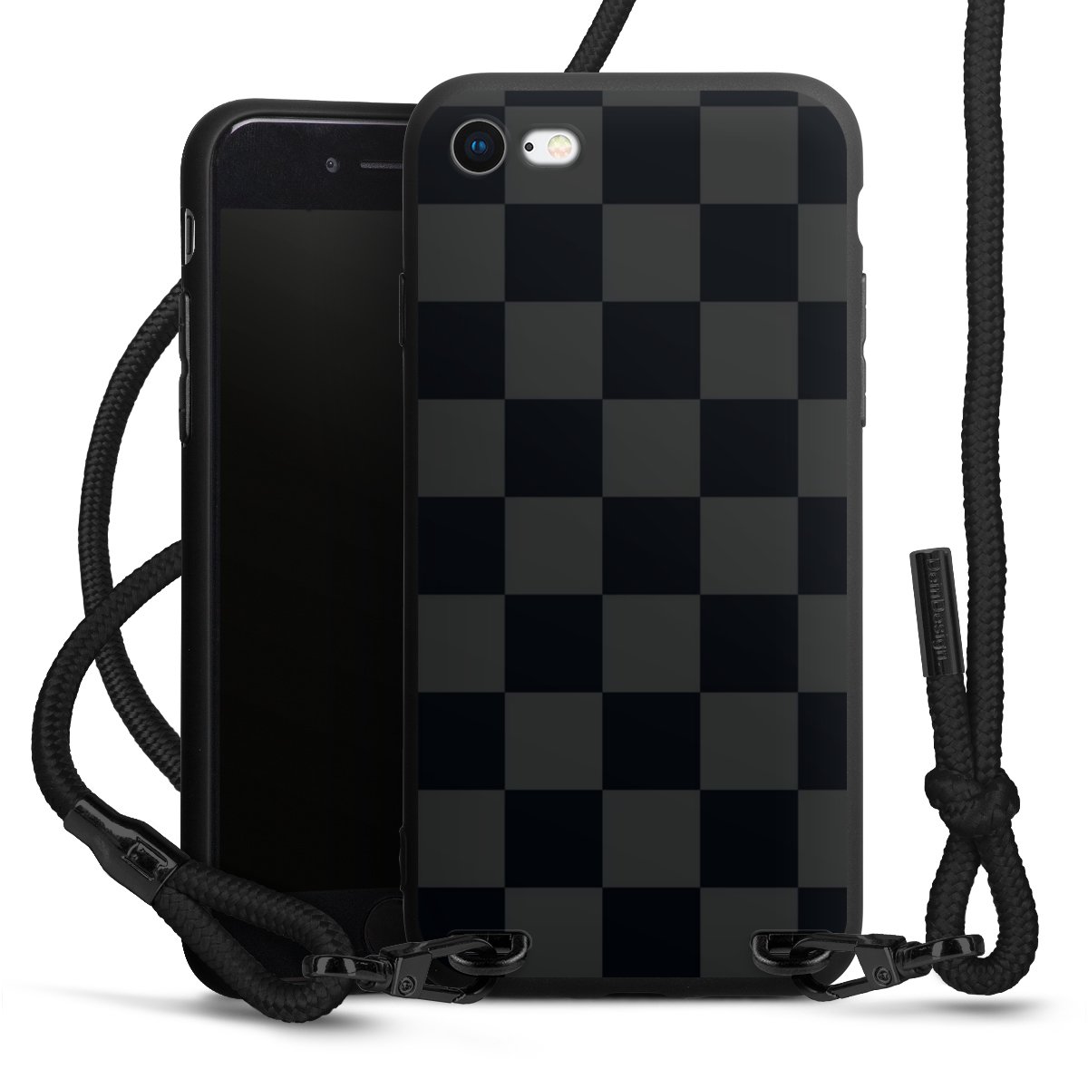 Pure Black: Handyhülle, Stoffband und Metalldetails in stylischem Mattschwarz.