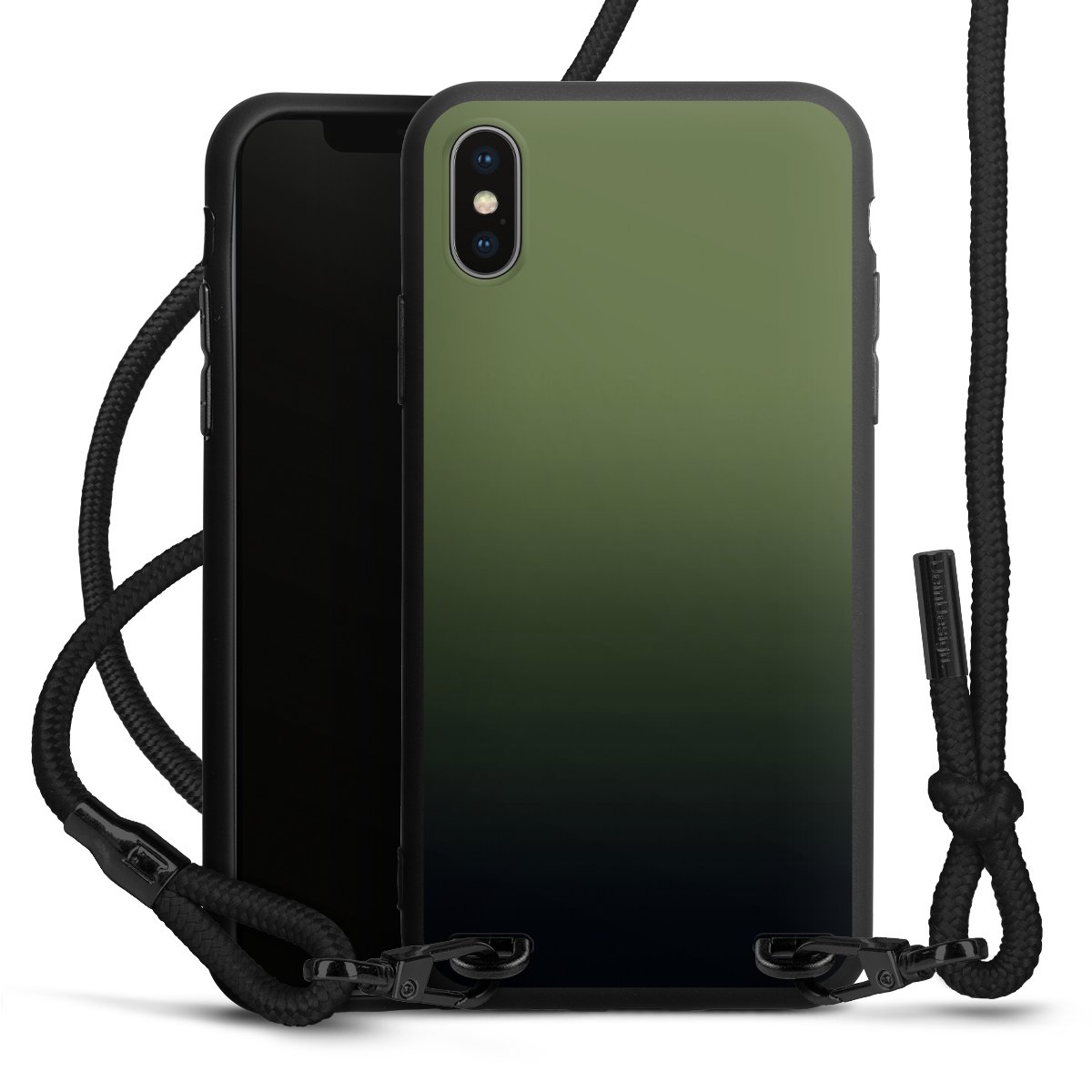 Pure Black: Handyhülle, Stoffband und Metalldetails in stylischem Mattschwarz.