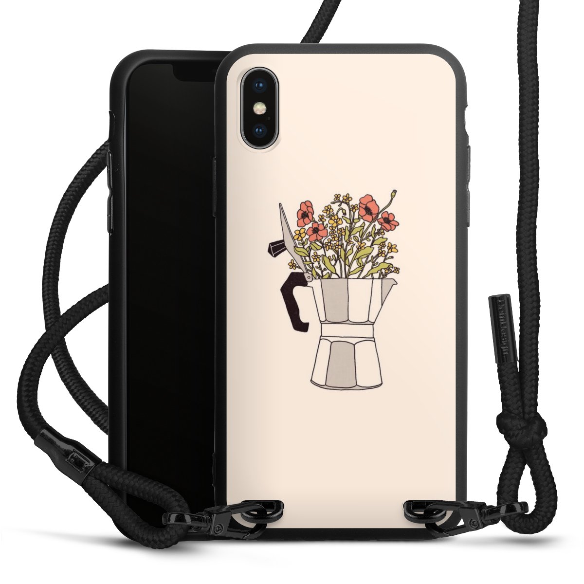 Pure Black: Handyhülle, Stoffband und Metalldetails in stylischem Mattschwarz.