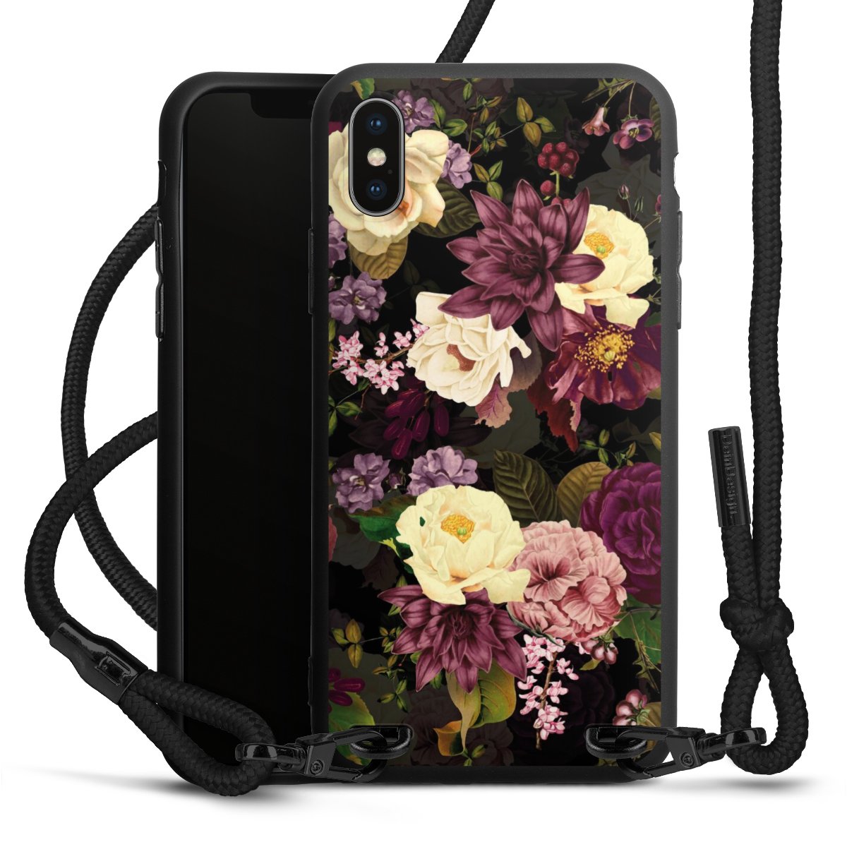 Pure Black: Handyhülle, Stoffband und Metalldetails in stylischem Mattschwarz.