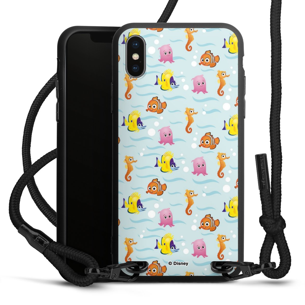 Pure Black: Handyhülle, Stoffband und Metalldetails in stylischem Mattschwarz.