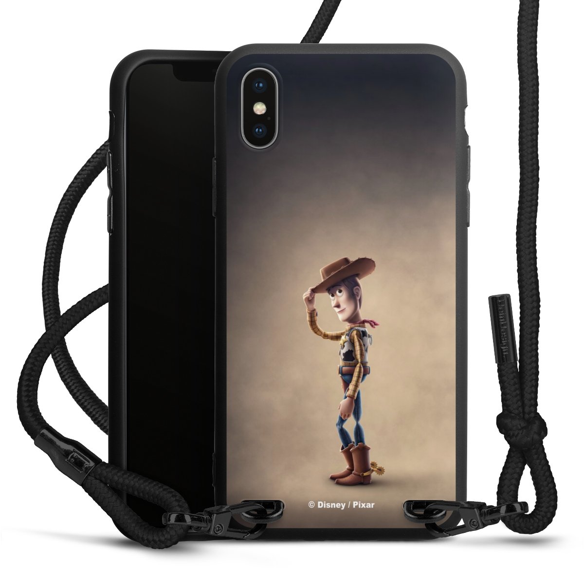 Pure Black: Handyhülle, Stoffband und Metalldetails in stylischem Mattschwarz.
