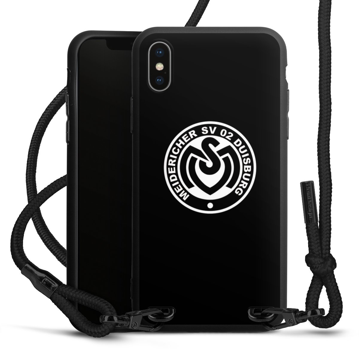 Pure Black: Handyhülle, Stoffband und Metalldetails in stylischem Mattschwarz.