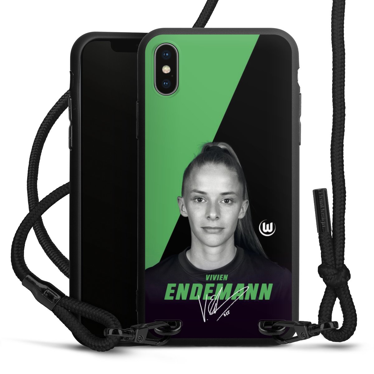 Pure Black: Handyhülle, Stoffband und Metalldetails in stylischem Mattschwarz.
