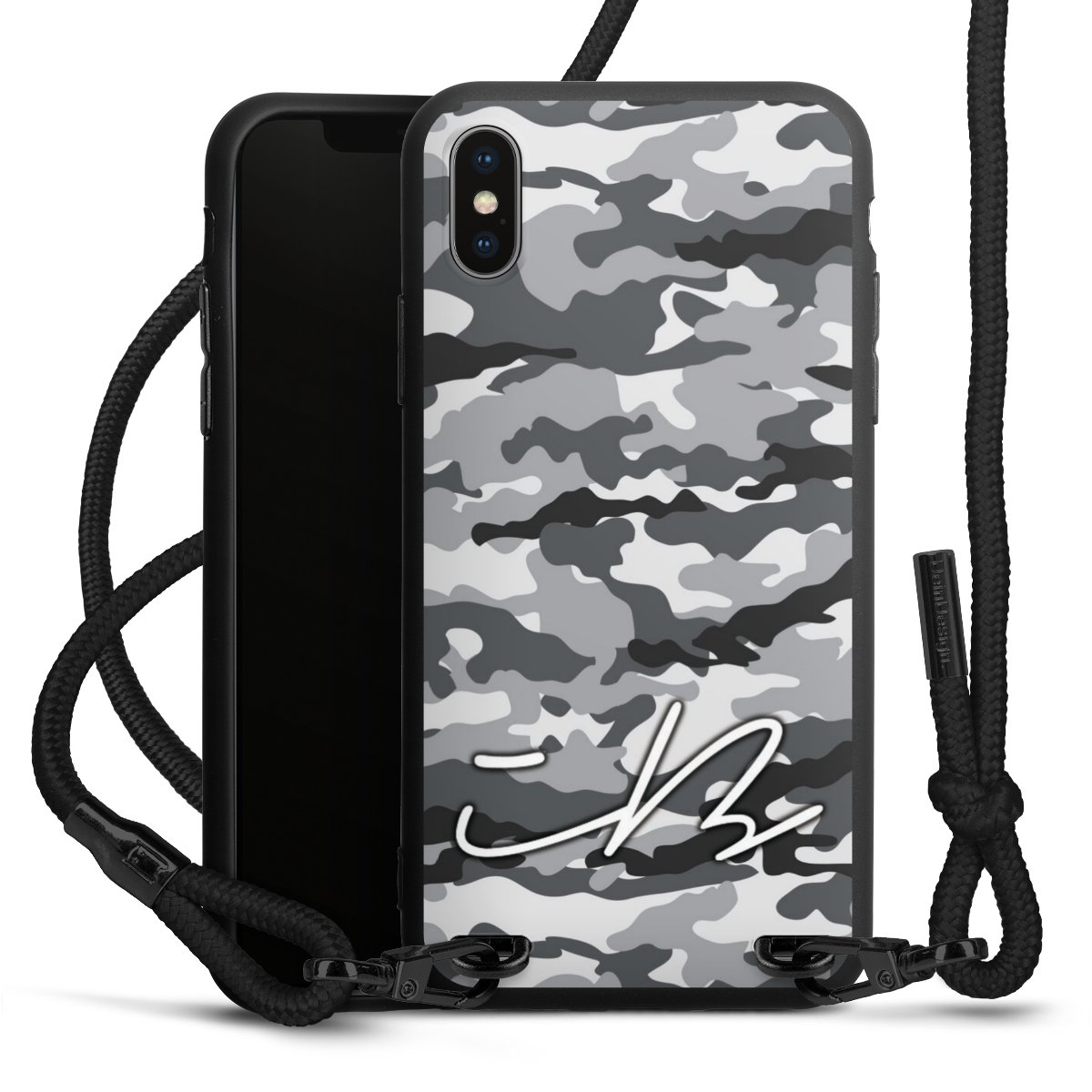 Pure Black: Handyhülle, Stoffband und Metalldetails in stylischem Mattschwarz.