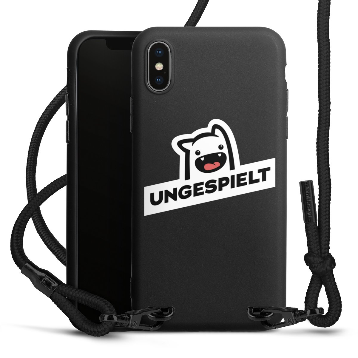 Pure Black: Handyhülle, Stoffband und Metalldetails in stylischem Mattschwarz.