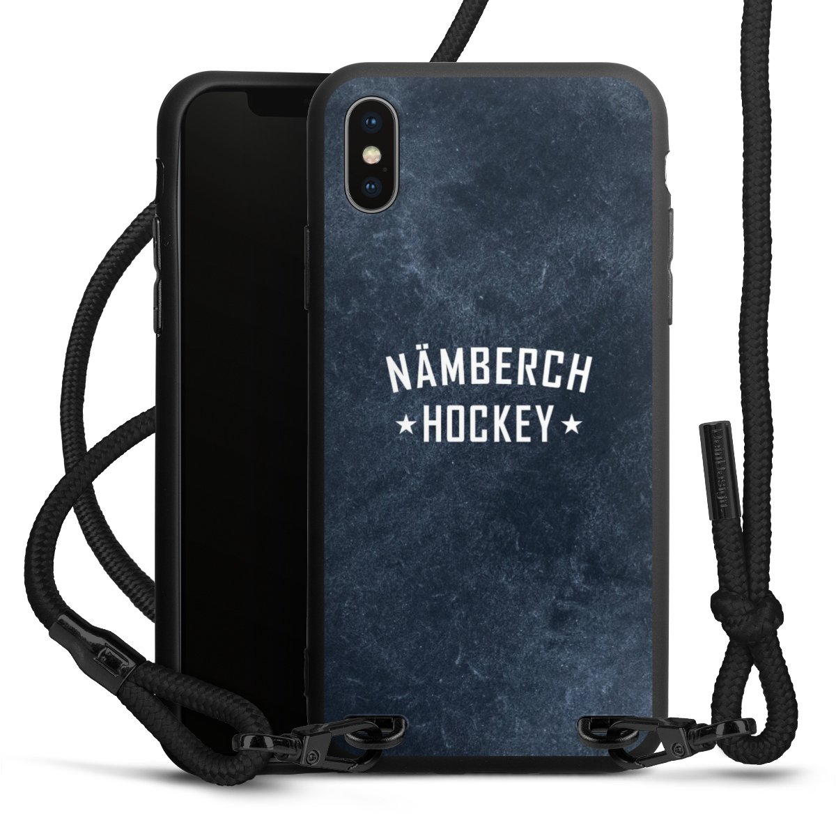 Pure Black: Handyhülle, Stoffband und Metalldetails in stylischem Mattschwarz.