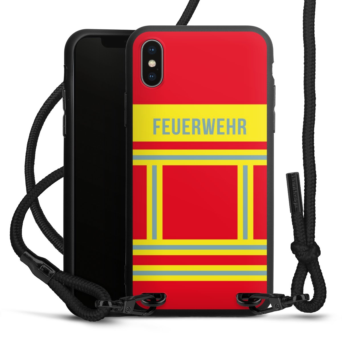 Pure Black: Handyhülle, Stoffband und Metalldetails in stylischem Mattschwarz.