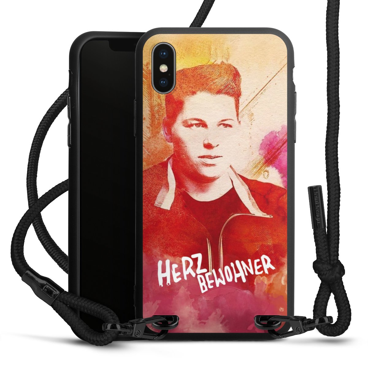 Pure Black: Handyhülle, Stoffband und Metalldetails in stylischem Mattschwarz.