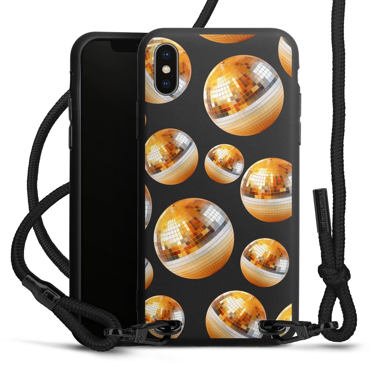 Pure Black: Handyhülle, Stoffband und Metalldetails in stylischem Mattschwarz.
