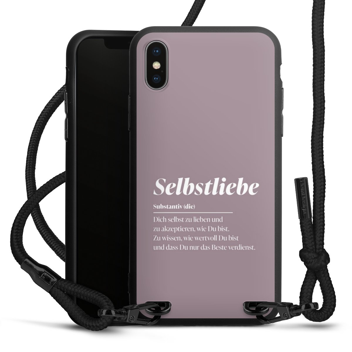 Pure Black: Handyhülle, Stoffband und Metalldetails in stylischem Mattschwarz.