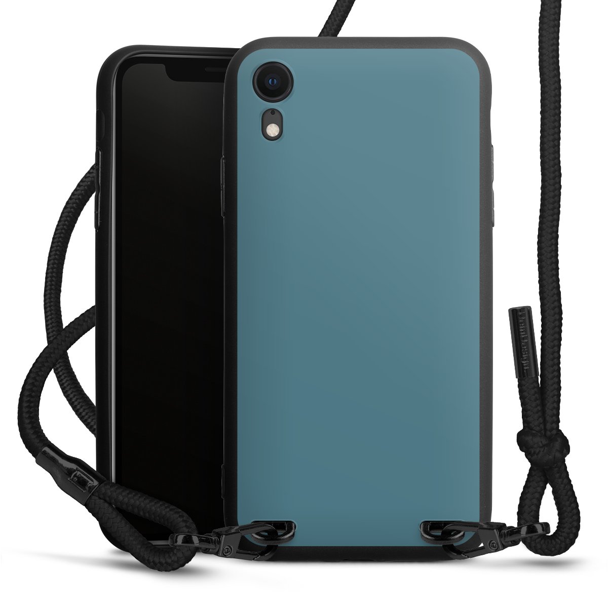 Pure Black: Handyhülle, Stoffband und Metalldetails in stylischem Mattschwarz.