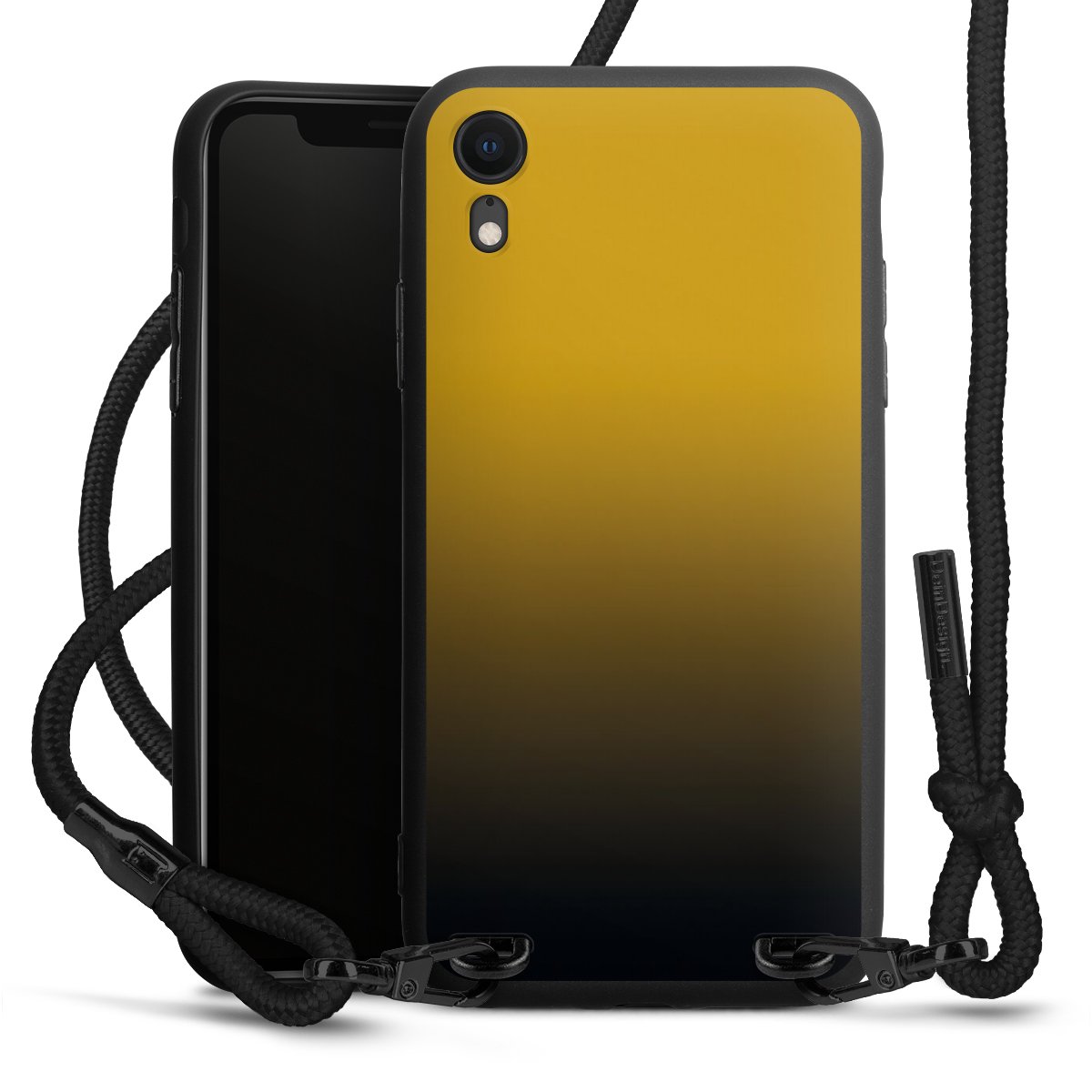 Pure Black: Handyhülle, Stoffband und Metalldetails in stylischem Mattschwarz.